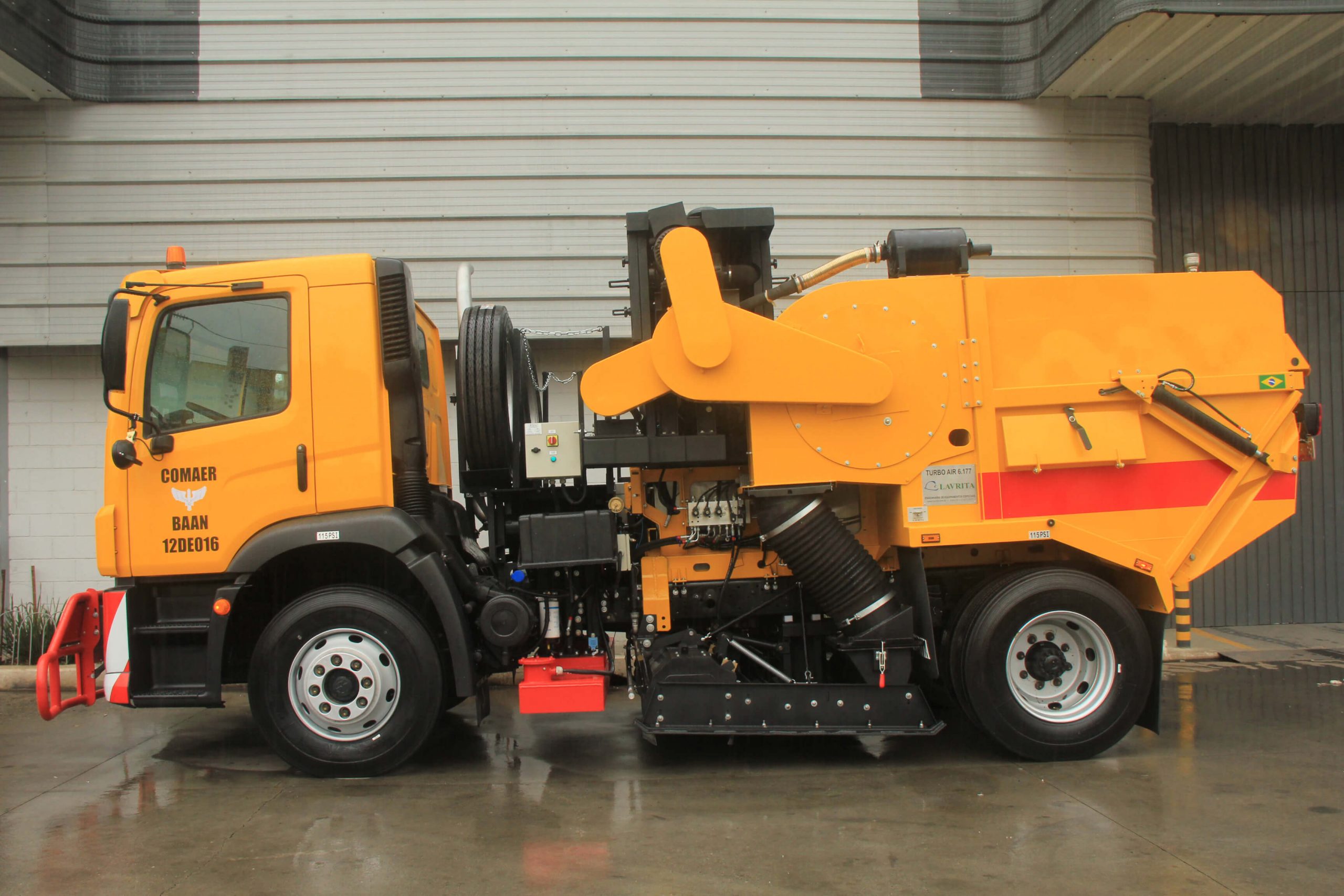 O princípio operacional deste caminhão limpa pistas e limpa pátios é de aspiração de detritos. O processo se dá através de injeção de ar controlada para desagregar a sujeira da superfície.