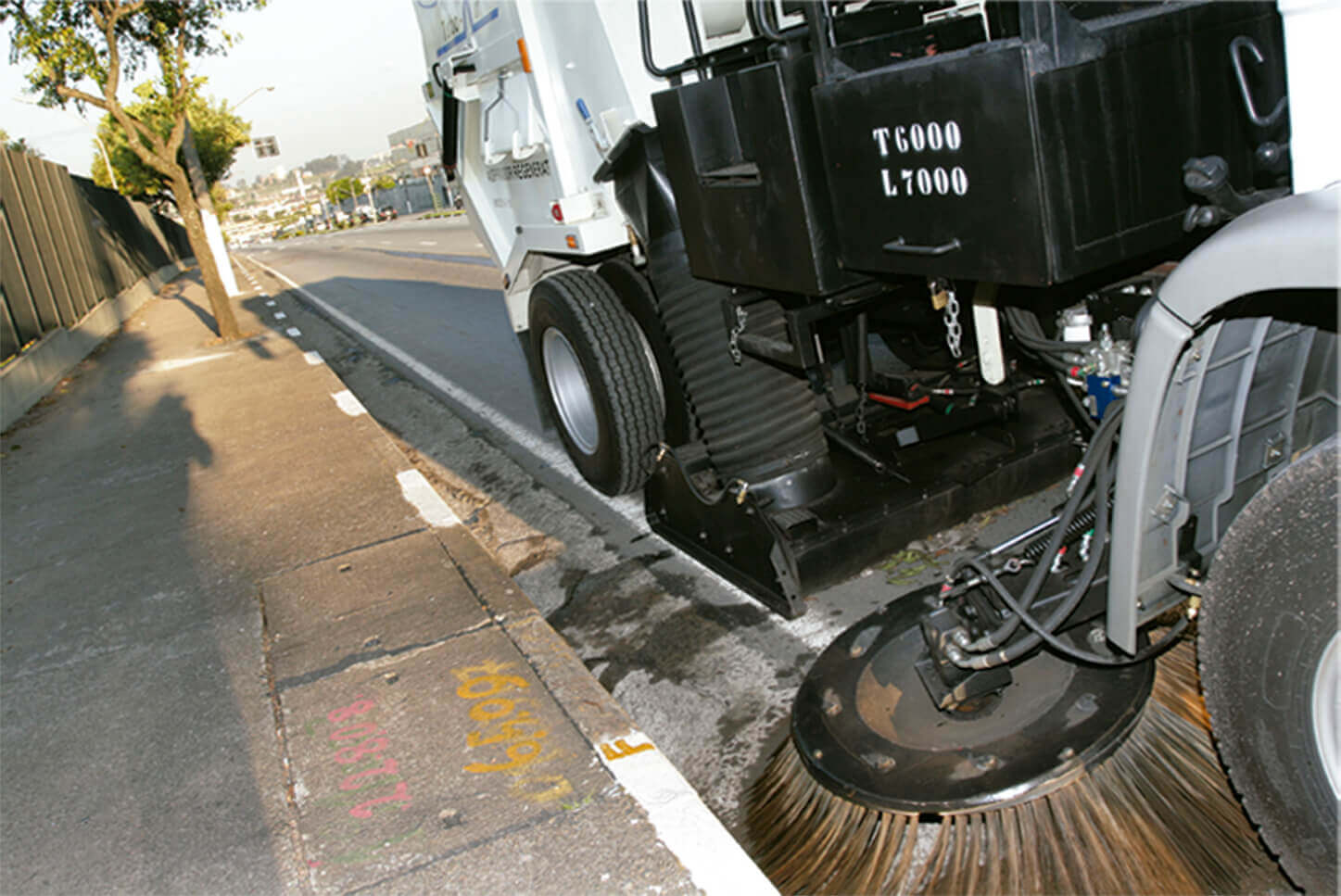A varredeira mecânica urbana dispõe de escovas laterais que auxiliam na limpeza de guias e sarjetas, deslocando os detritos para a área de atuação da coifa.