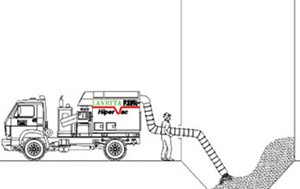 Através do equipamento autônomo a vácuo (HIPERVAC 8 -150), montado sobre chassi de caminhão, o material é succionado para o interior do reservatório e basculado em local determinado pelo contratante.